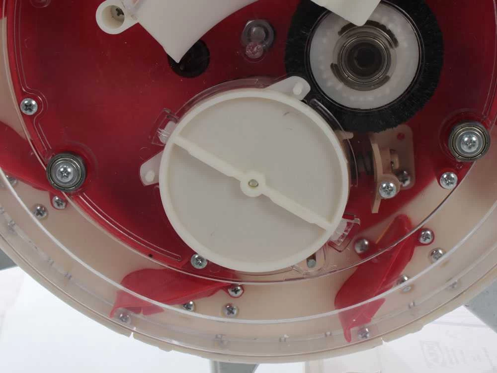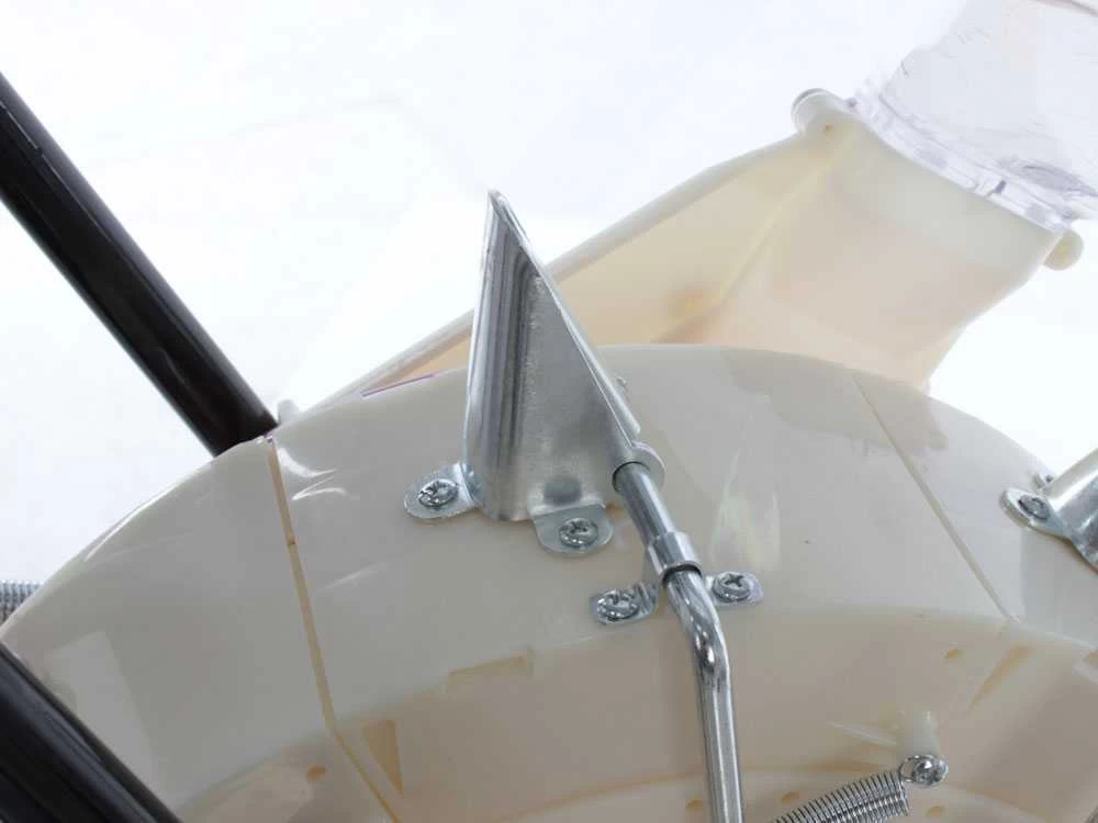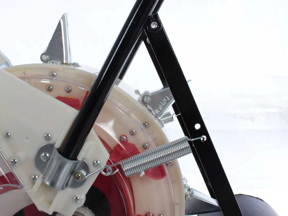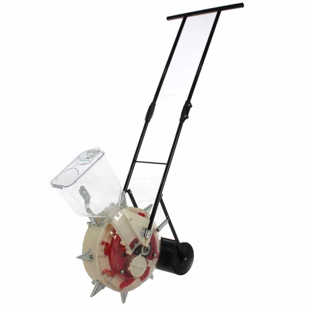 All’apice del rullo è presente il contenitore in plastica per le semenza, che ha una capacità di 9,5 kg. La è cosiderata una macchina robusta e con ottime capacità performanti. La è in lega di alluminio, e la ruota posteriore in plastica spessa e resistente. il braccetto della ruota posteriore è unito alla macchina tramite due molle che facilitano parecchio la spinta.