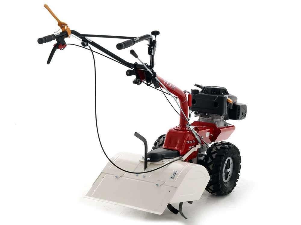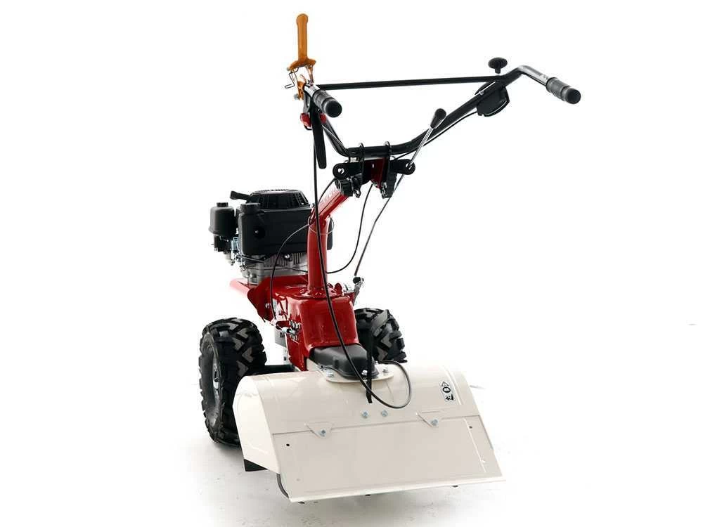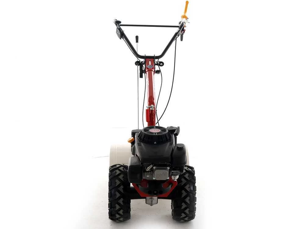 Motocoltivatore semovente con motore a benzina 4 tempi, spinto dalle grandi ruote scolpite trazionate collegate ad una trasmissione ad ingranaggi in bagno d’olio.
