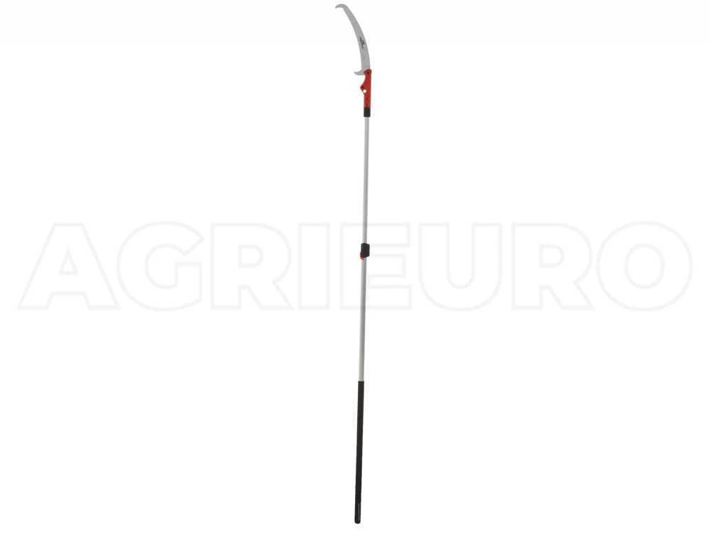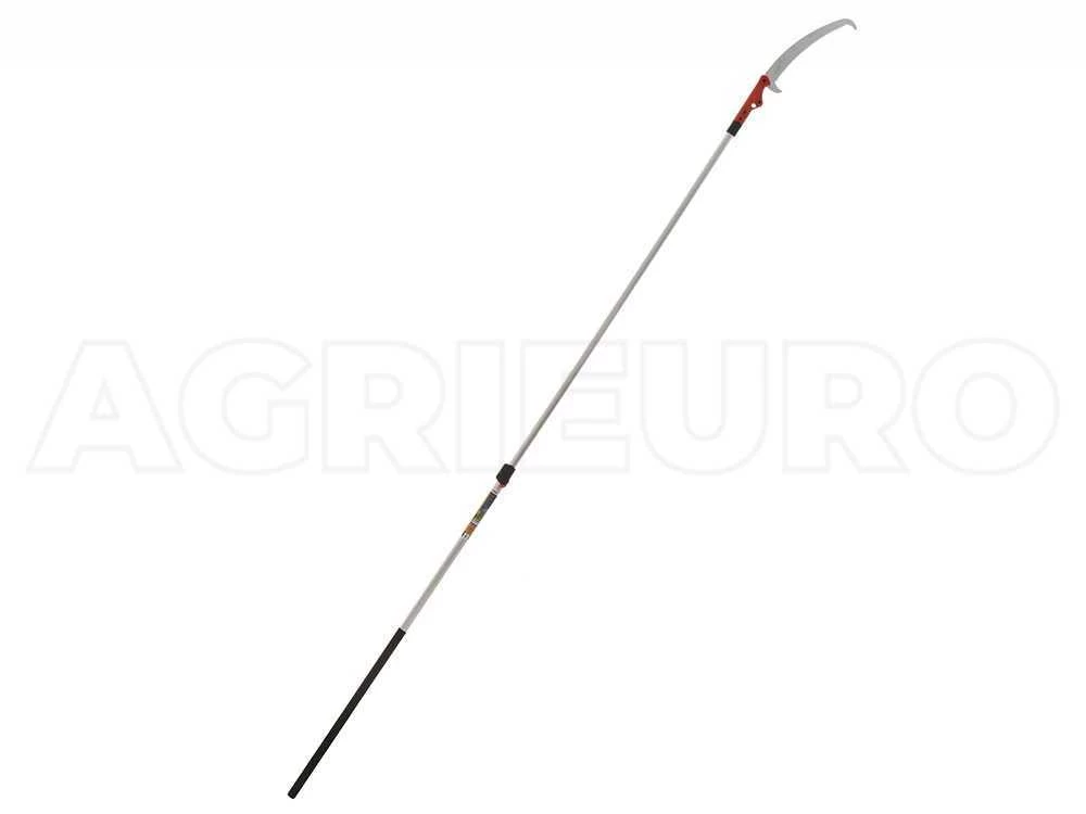 L’asta telescopica è regolabile e va da un minimo (segaccio compreso) di 230 cm ad un massimo di 385 cm. Sull’ asta sono presenti fori per poter bloccare il pulsante caricato a molla fino a 6 diverse lunghezze.